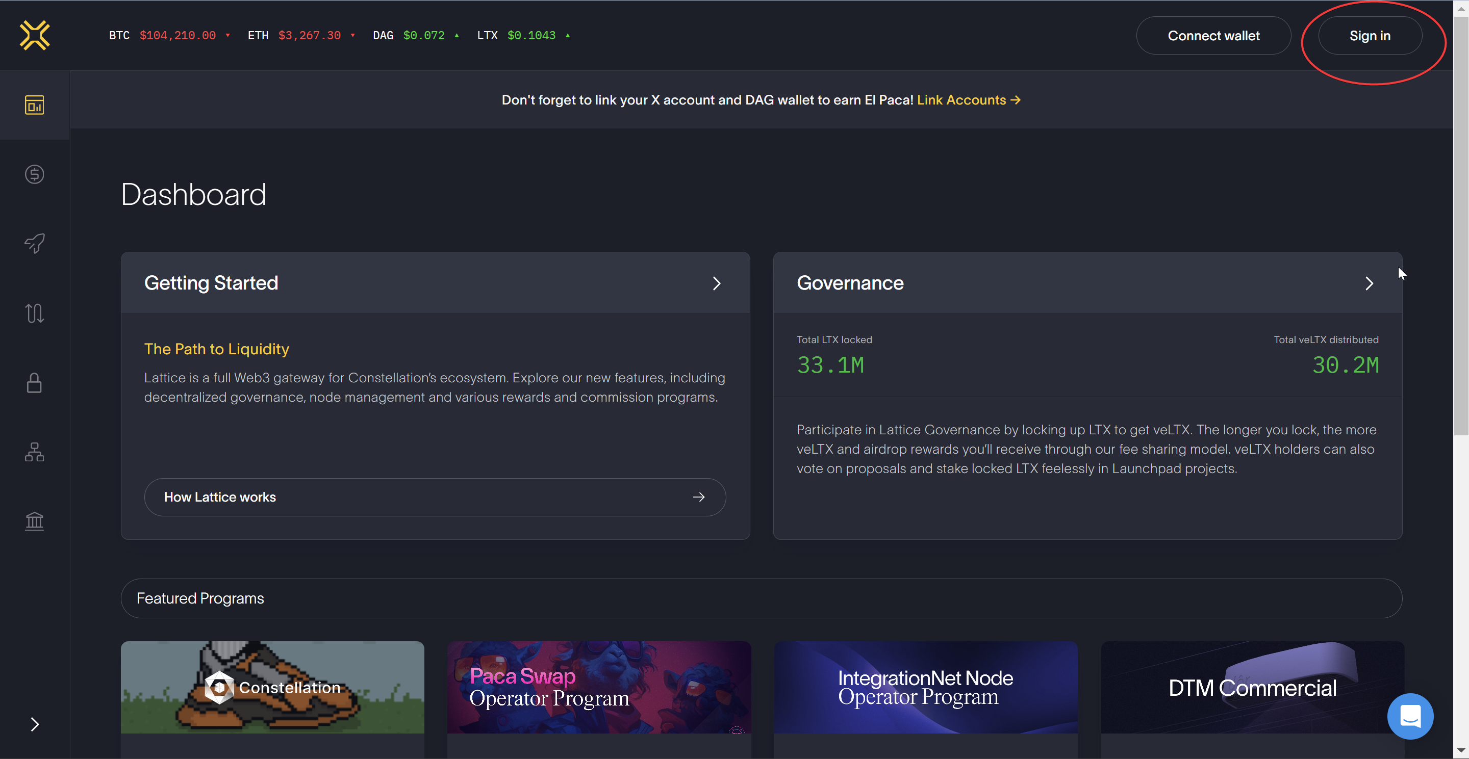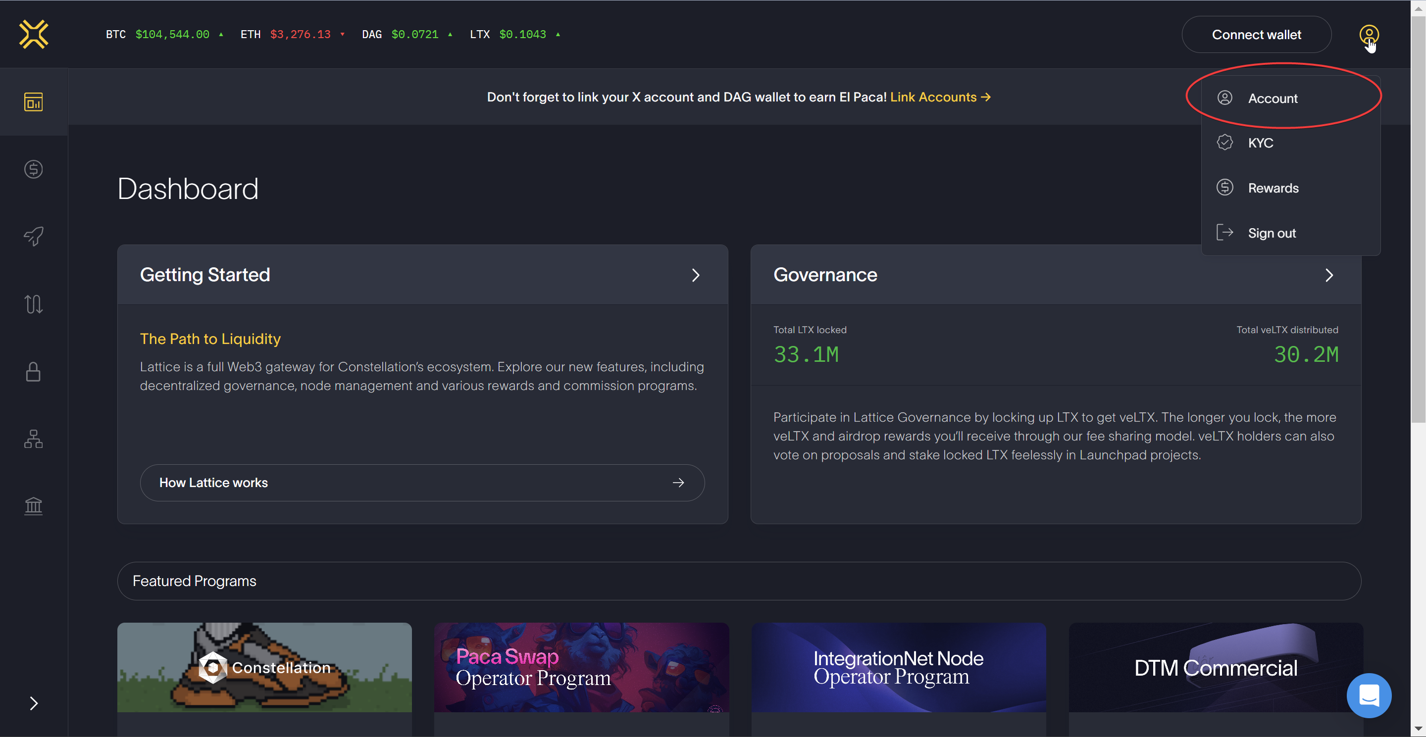 * If it’s not already linked, click **Link Wallet** and follow the instructions to add your DAG address.