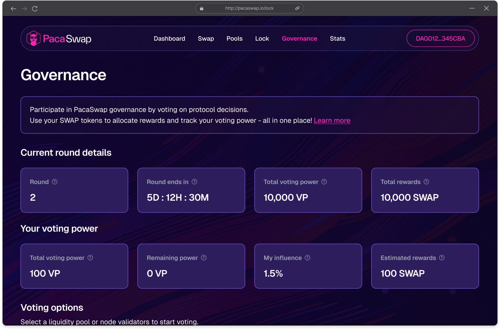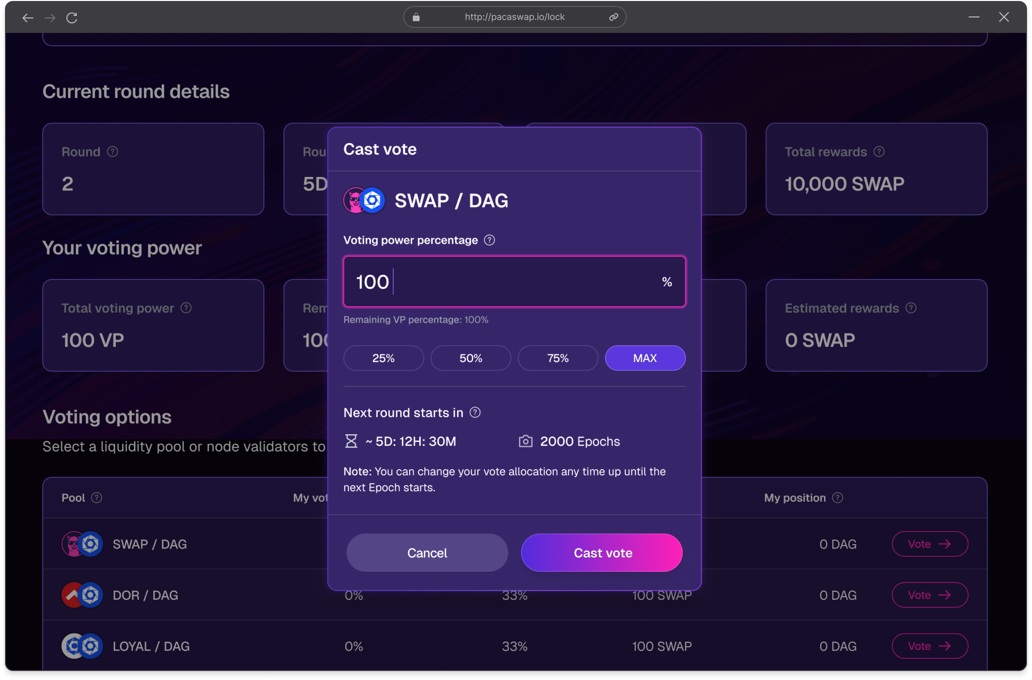 Every month, Pacaswap holds a voting round that determines how the DEX's emission rewards are allocated across liquidity pools and node operators. This community-driven approach ensures that users with voting power (obtained by locking SWAP tokens) directly influence which pools receive the most rewards for that round.